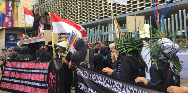 Dari pantauan redaksi, massa kompak mengenakan pakaian hitam, diantaranya ada barisan emak-emak yang mengenakan daun palma. Aksi mereka semakin semarak dengan bendera merah putih yang dikibarkan.