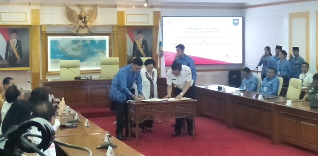 Penandatangan dilakukan Mendagri Tjahjo Kumolo bersama Plt Kepala BPIP Hariyono dan disaksikan oleh Ketua Dewan Pengarah BPIP Megawati Soekarnoputri dan Wakil Ketua Dewan Pengarah BPIP Try Sutrisno di Gedung A, Kemendagri, Jakarta Pusat, Senin (20/5).
