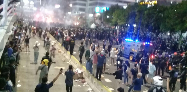 Massa aksi yang masih bertahan di persimpangan ruas Jalan MH Thamrin, Jakarta Pusat, dekat kantor pusat Bawaslu, sontan melempari batu karena menyangka akan diserang.