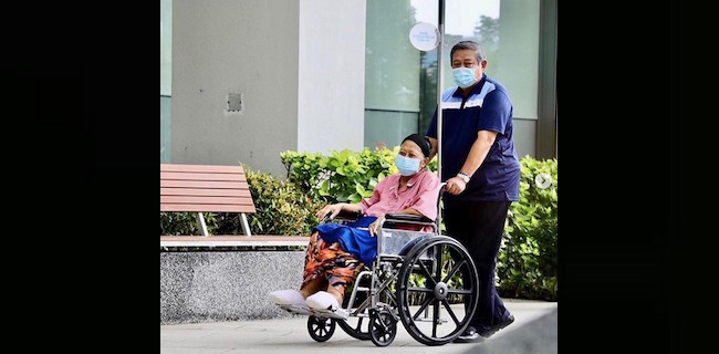 Pada foto pertama tampak sang suami, Susilo Bambang Yudhoyono, mendorong Ibu Ani Yudhoyono yang duduk di atas kursi roda.