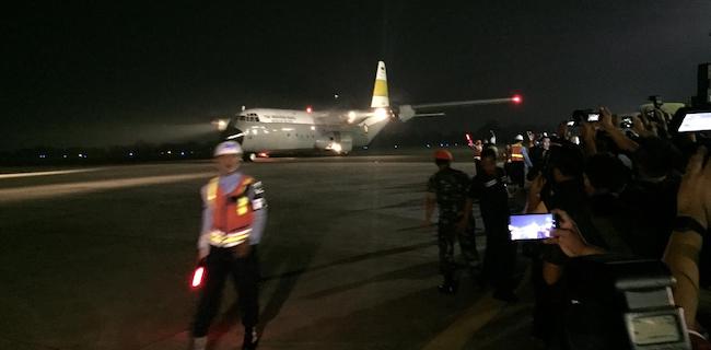 Jenazah dibawa dengan pesawat Hercules milik TNI Angkatan Udara. Jenazah yang berada dalam peti berbalut bendera merah putih dan bunga mulai dikeluarkan dari pintu yang berada di belakang pesawat.