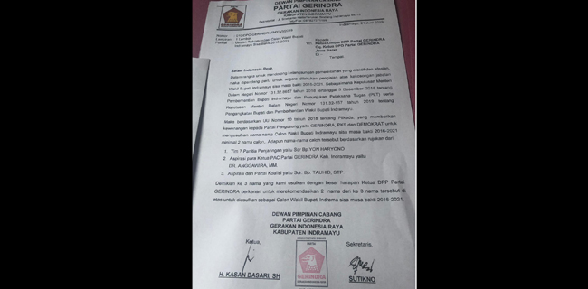Untuk mengisi kekosongan jabatan wabup Indramayu, berdasarkan surat Bupati Indramayu Nomor: 170/1733/Otda tanggal 19 Juni 2019, Gerindra mengusulkan tiga nama berdasarkan surat Dewan Pimpinan Cabang (DPC) Kabupaten Indramayu nomor: 010/DPC-GERINDRA/IMY/VI/2019.
