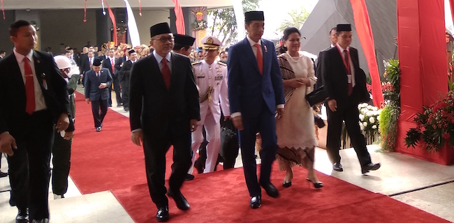 Tiba sekira pukul 7.55 WIB, Presiden Jokowi mengenakan setelan jas berdasi merah dengan peci hitam. Dia datang didampingi istri, Iriana Jokowi yang tampil anggun dengan kebaya putih dan selendang batik.