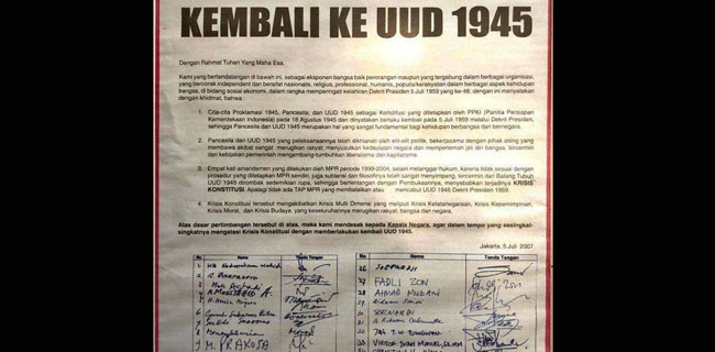 Kantor Berita Politik RMOL, dokumen pernyataan itu diterbitkan dalam rangka memperingati Dekrit Presiden 5 Juli 1959 yang ke-48.