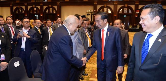 Saat memasuki acara Presiden Joko Widodo menyempatkan menyalami salah satu peserta orientasi yang terpilih sebagai anggota DPR RI periode tahun 2019-2024, H. Alex Noerdin.