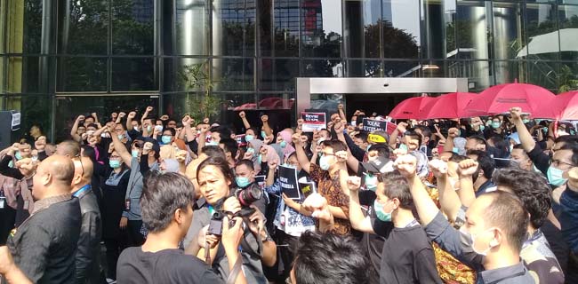 Ratusan Pegawai KPK ini juga membentangkan pamflet dan poster-poster #SaveKPK #TolakRevisiUUKPK #CapimBermasalahDilarangMasuk #PakJokowiDimana.
