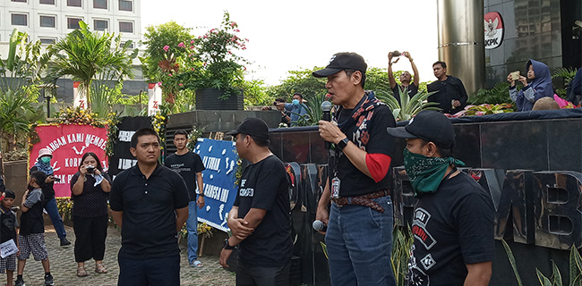 Secara menggebu-gebu, Saut yang juga mengenakan kaos warna hitam itu berorasi di depan WP KPK.