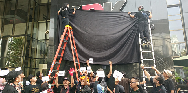 Selain orasi, mereka juga melakukan aksi simbolik menutup logo KPK dengan kain berwarna hitam. Berdasarkan pengamatan