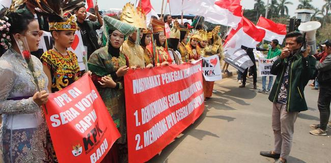 Dalam aksi ini, mereka membawa spanduk bertuliskan "Masyarakat Penegak Demokrasi Demi Demokrasi Sehat, Dukung Revisi UU KPK, Mendorong DPR RI Segera Voting Capim KPK Baruâ€.