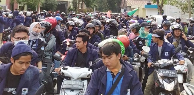 Berbeda dengan kemarin yang berangkat menggunakan bus dan truk, kali ini para mahasiswa turut menggelar konvoi menggunakan sepeda motor.