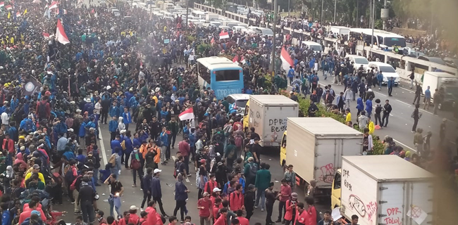 Aparat kepolisian berhasil memaksa ribuan mahasiswa yang tengah menggelar aksi unjuk rasa di Gedung DPR RI, Senayan, Jakarta, Selasa (24/9) untuk mundur dan membubarkan diri.
