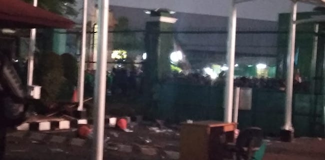 Kantor Berita Politik RMOL, ratusan mahasiswa melempari pos pengamanan DPR dengan batu hingga menghancurkan kaca.