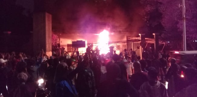 Di sisi lain, mahasiswa turut melakukan pembakaran gerbang Tol Pejompongan yang terletak di depan Gedung MPR/DPR RI, Selasa (24/9) malam.