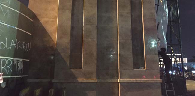 "Ini lagi dibersihin pakai tinner tadi banyak tulisan," ucap Pak We di lokasi, Senayan, Selasa(24/9).