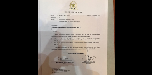 "Kami sampaikan dengan hormat, kelompok DPD di MPR menyampaikan dukungan terhadap Bambang Soesatyo asal Fraksi Golkar di MPR sebagai ketua MPR," isi petikan dalam surat dukungan senator.