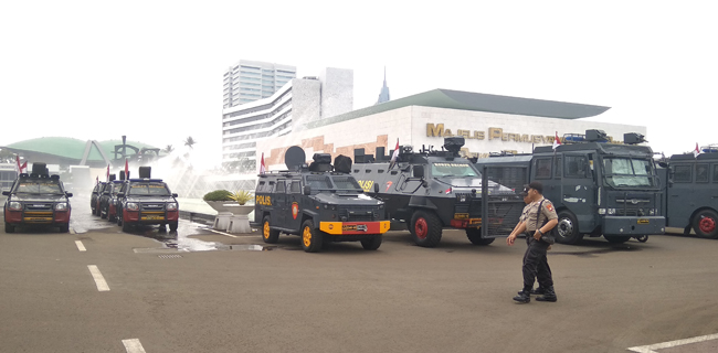 Selain ribuan personel petugas, sejumlah kendaraan taktis jenis barracuda, water cannon, barrier juga disiagakan di gerbang Komplek Parlemen.