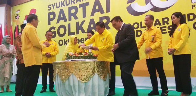 "Malam ini kita rayakan HUT dengan sederhana, dengan potong tumpeng," ujar Ketua Umum Partai Golkar, Airlangga Hartarto dalam sambutannya.