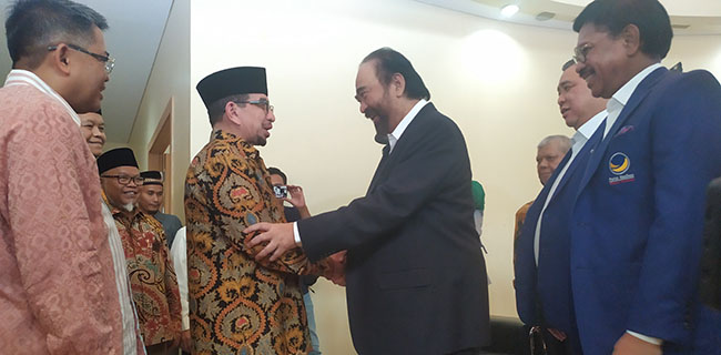 Rombongan Nasdem langsung diantarkan ke ruang pertemuan. Mereka terlihat duduk di meja panjang yang disuguhkan makanan dan minuman.