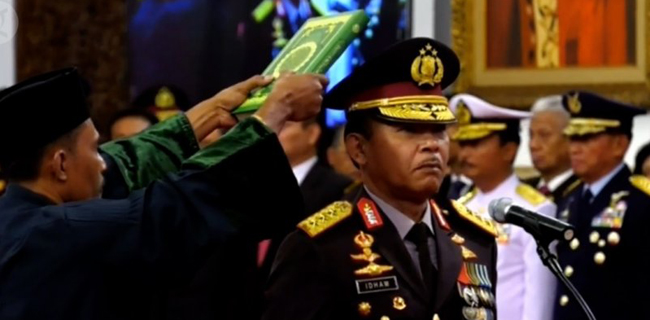 Usai pembacaan Keputusan Presiden, Jokowi membimbing Jenderal Idham Azis untuk diambil sumpahnya sebagai Kapolri, yang berbunyi: