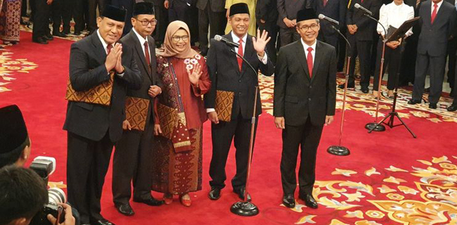 Presiden Joko Widodo resmi melantik lima pimpinan KPK periode 2019-2023. Mereka adalah Firli Bahuri (ketua), Lili Pintauli Siregar, Nurul Ghufron, Nawawi Pomolango, dan Alexander Marwata sebagai wakil ketua merangkap anggota.