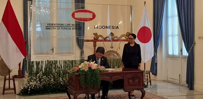 Bersama Motegi, turut hadir pula Dutabesar Jepang untuk RI, Isshi Masafumi dan rombongan lainnya.