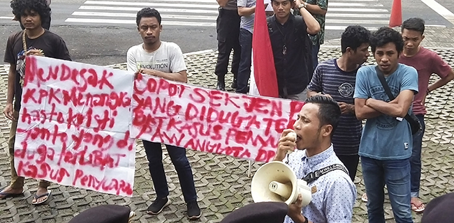"Kami menuntut dan mendesak KPK menjemput paksa Sekjen PDIP yang diduga terlibat dalam kasus penyuapan PAW salah satu anggota DPR PDIP," kata Roni Kasongat dalam orasinya.