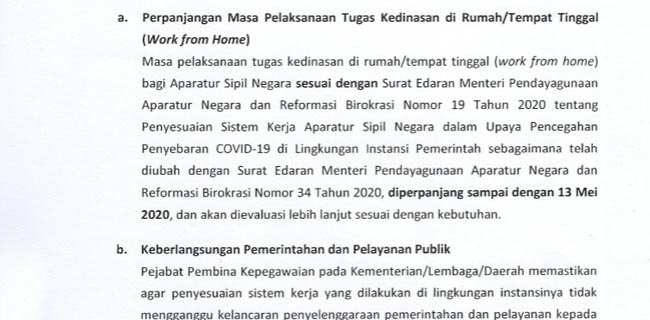 Dalam surat itu, Politisi PDIP itu menyatakan bahwa keputusan perpanjangan kebijakan bekerja di rumah sewaktu-waktu akan dievaluasi lebih lanjut sesuai dengan kebutuhan pemerintah.