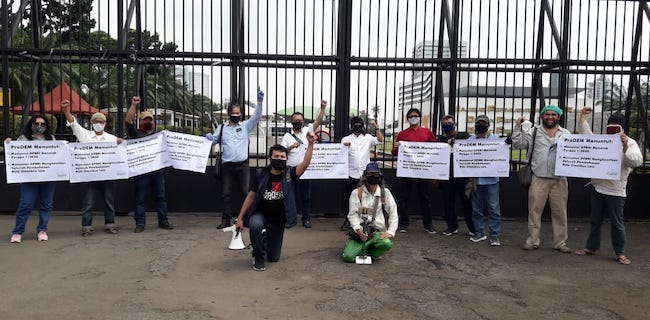 Pada siang ini, Selasa (28/4), belasan orang pengurus ProDEM menggeruduk gedung DPR RI, di Jalan Gatot Subroto, Jakarta. Aksi dipimpin langsung Ketua ProDEM, Iwan Sumule dan digelar dengan tetap menaati protokol Covid-19, yakni menjaga jarak dan menggunakan masker.