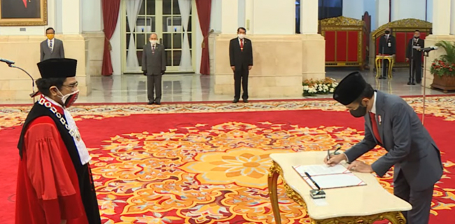 Dalam siaran virtual yang disiarkan dari Istana Kepresidenan Jakarta, usai melantik dan menyaksikan sumpah jabatan Ketua Mahkamah Agung (MA) terpilih Muhammad Syarifuddin, Jokowi langsung menyaksikan pengucapan janji Hakim Konstitusi oleh Manahan MP Sitompul.
