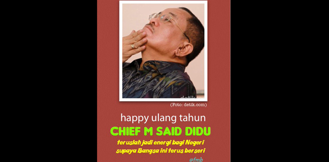"Selamat merayakan hari kelahiran sahabat @msaid_didu. Tetap sehat, energik dan senantiasa memperoleh rahmat dari Allah SWT untuk terus menjadi suluh yang membuat negeri kita selalu berseri," ucap mantan menteri Presiden Jokowi pada Kabinet Kerja lewat akun @TheOfficialFMB.