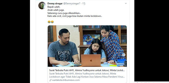 Ibunda Almira, Annisa Pohan, menduga bahwa putrinya yang masih di bawah umur telah menjadi korban olok-olokan politik dari salah satu akun media sosial @Dennysiregar7 di twitter.
