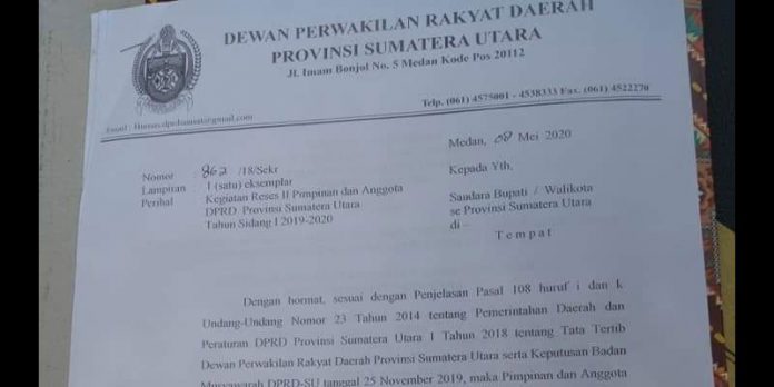 Surat tersebut ditujukan kepada bupati dan walikota se-Sumatera Utara, di mana dijelaskan bahwa pelaksanaan kegiatan reses tersebut mengacu pada UU nomor 23 tahun 2014 tentang Pemerintahan Daerah.