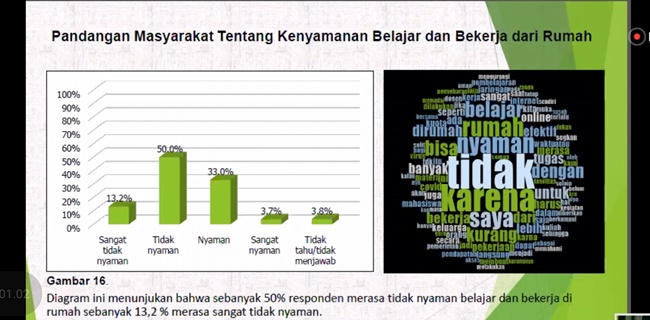 "Sebanyak 50 persen responden merasa tidak nyaman belajar dan bekerja di rumah. Sebanyak 13,2 persen merasa sangat tidak nyaman. Sedangkan yang nyaman hanya 33 persen dan sangat nyaman hanya 3,7 persen," kata Direktur Konsultasi dan Kerjasama CESPELS, Fuad Adnan, Senin (11/5).