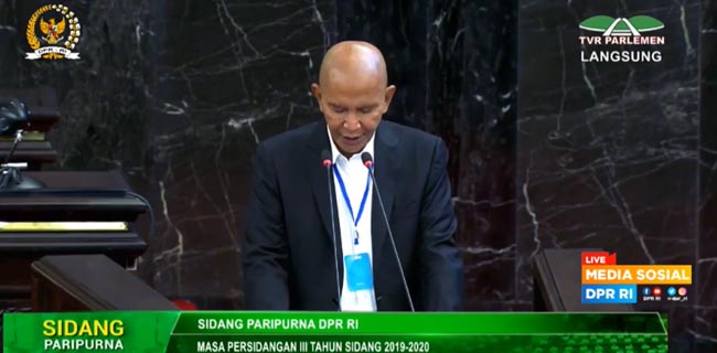 Ketua Banggar DPR RI Said Abdullah membacakan draft pandangan tiap fraksi dalam rapat paripurna ke-15 penutupan sidang ke-3 DPR RI, di Gedung Nusantara II, Komplek Parlemen, Senayan, Selasa (12/5).