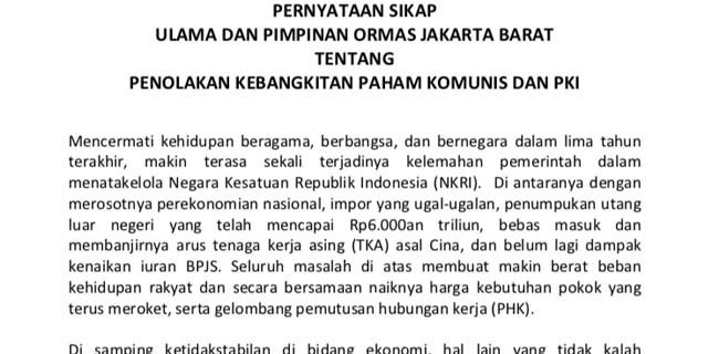 “Mendesak Presiden Joko Widodo untuk mengambil kebijakan dan langkah- langkah nyata yang tegas dan terukur, serta memerintahkan aparat hukum dan keamanan untuk mencegah kebangkitan paham komunis dan PKI,†sebut surat pernyataan sikap tersebut.