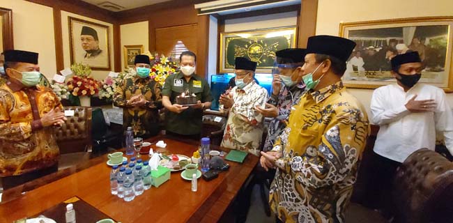 Kantor Berita Politik RMOL di lokasi, usai membahas RUU HIP, Bambang Soesatyo bersama empat anak buahnya yakni Arsul Sani, Zulkifli Hasan, Ahmad Basarah, Syarief Hasan memberikan kejutan kepada kiai Said dengan sebuah kue ulang tahun.