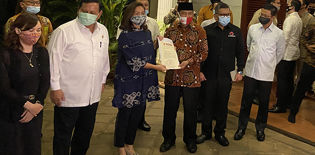 Ketua Umum Partai Gerindra Prabowo Subianto didampingi Sekretaris Jenderal PDIP Hasto Kristiyanto secara langsung menyerahkan rekomendasi Muhammad-Rahayu Saraswati Djojohadikusumo di kediaman Prabowo, Jalan Kertanegara IV, Jakarta Selatan, Senin (20/7).