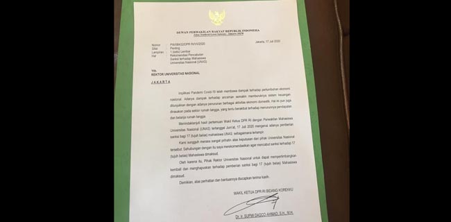 Usai menerima kedatangan mahasiswa Unas yang mendapatkan sanksi akademik di Senayan (Jumat (17/7), dengan surat berkop resmi DPR RI, Sufmi secara jelas memberikan rekomendasi kepada Rektor Unas agar menghapuskan pemberian sanksi terhadap 17 mahasiswa tersebut.