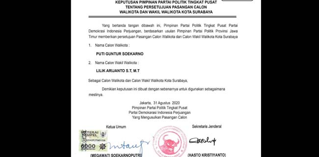 Surat itu ditandatangani di atas materai Rp 6.000 oleh Ketua Umum PDIP Megawati Soekarnoputri dan Sekretaris Jenderalnya, Hasto Kristiyanto. Kantor Berita Politik RMOL berusaha mengkonfirmasi kepada pengurus DPP PDIP.