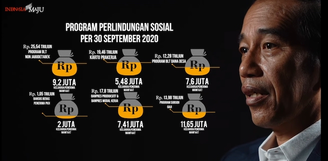 Dalam sebuah video yang diunggah di akun YouTube Sekretariat Presiden, Sabtu (3/10) malam, Presiden Jokowi menampilkan data program bantuan sosial yang telah dikeluarkannya per 30 September 2020.
