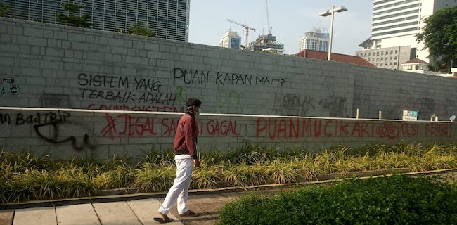 Tembok gedung Kedutaan Besar Amerika Serikat yang berada di Jalan Merdeka Selatan, Jakarta Pusat masih dipenuhi dengan coretan-coretan yang isinya mengumpat DPR, termasuk Ketua DPR Puan Maharani.