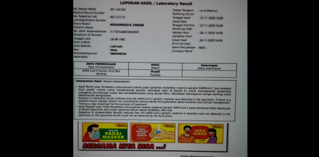 Masih di gambar yang beredar itu, hasil pemeriksaan atas nama Muhammad R. Shihab dinyatakan positif Covid-19.