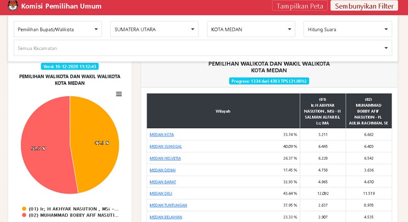 Dalam publikasi Sirekap per Kamis (10/12) pukul 11:47, KPU Kota Medan telah berhasil mengupload data hasil penghitungan suara untuk 1,334 Tempat Pemungutan Suara (TPS), atau sekitar 31 persen dari total 4.303 TPS.