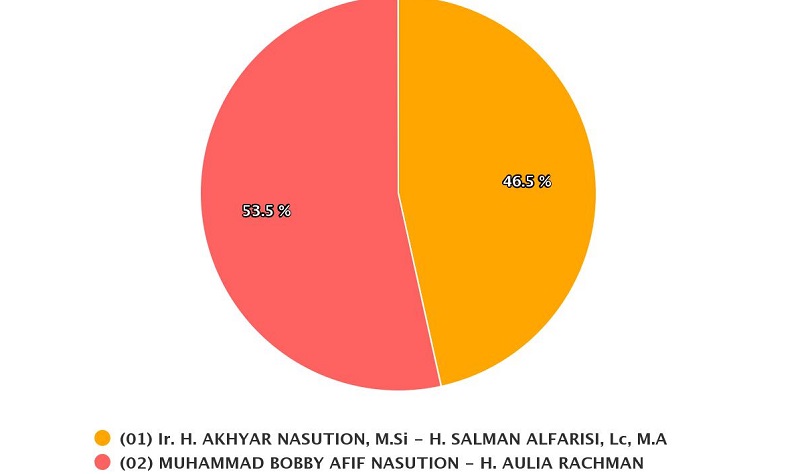 Sedangkan, pasangan Bobby-Aulia memperoleh suara sebanyak 393.533 suara, atau sekitar 53,5 persen dari total suara yang sudah masuk Sirekap.