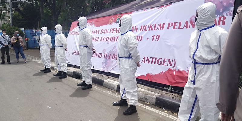 Posko tersebut terpampang banner yang bertuliskan "Operasi Kemanusiaan dan Penegakkan Hukum Pelanggar Protokol Kesehatan Covid-19; Pemeriksaan Rapid Tes dan Rapid Antigen†yang ditempel di depan tenda berwarna cokelat dengan ukuran sekitar 5 kali 4 meter persegi.