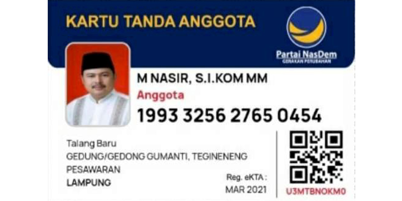 Kabar tersebut pun telah dikonfirmasi Nasir, usai beredarnya foto kartu tanda anggota (KTA) dengan foto dirinya sebagai kader Partai Nasdem Pesawaran melalui status WhatApp-nya pada Rabu (10/3) pukul 08.07 WIB.