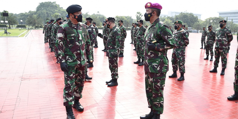 Panglima TNI Marsekal Hadi Tjahjanto menerima Laporan Korps Kenaikan Pangkat 56 Pati TNI terdiri dari 33 Pati TNI AD, 14 Pati TNI AL, dan 9 Pati TNI AU.