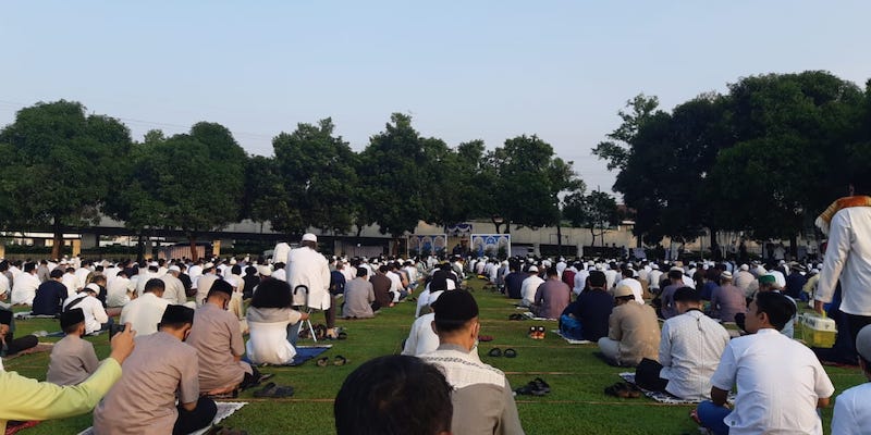 Imam Shalat Ied Masjid Al-Azhar Achmad Khatib bahkan merasa terharu dengan antusiasme jamaah yang. Mereka berbaris rapi dan tertib menjaga jarak saat memenuhi lapangan.