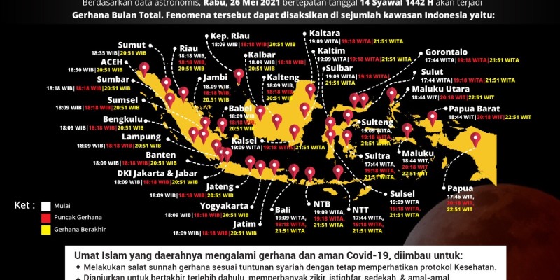 “Mempertimbangkan waktu terbit bulan di masing-masing daerah, maka Shalat Gerhana bisa dilakukan pada rentang setelah Salat Maghrib sampai selesai Gerhana sesuai dengan waktu di atas,†ujar Kamaruddin.