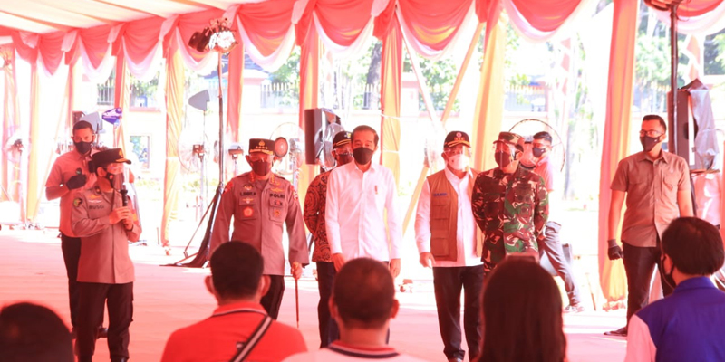 Kepala Negara didampingi Menteri Kesehatan RI Budi Gunadi Sadikin, Panglima TNI Marsekal Hadi Tjahjanto, Kapolri Jenderal Listyo Sigit Prabowo, dan Kepala BNPB Letjen TNI Ganip Warsito.